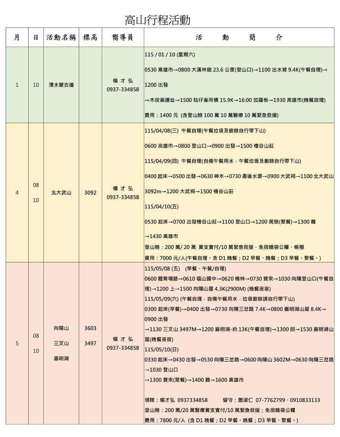 **:高山報名資料表 ; 高山百岳一覽表 ; 高山裝備表 ; 免揹睡袋公糧裝備表